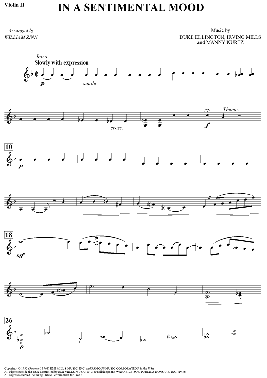 Digital Sheet Music for In A Sentimental Mood - Violin 2 by Duke Ellington, Irving Mills, Manny Kurtz, William Zinn scored for String Ensemble; id:453172