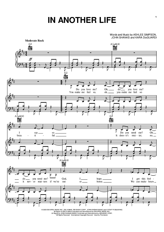 Digital Sheet Music for In Another Life by John Shanks, Kara DioGuardi, Ashlee Simpson scored for Piano/Vocal/Chords; id:388625