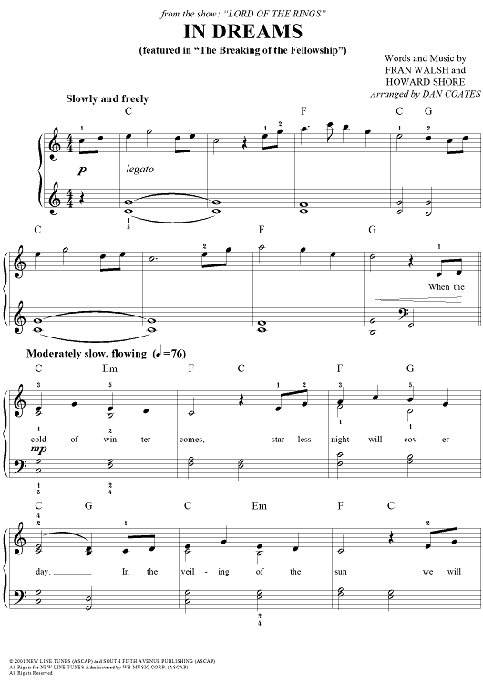 Digital Sheet Music for In Dreams by Dan Coates, Howard Shore, Fran Walsh scored for Easy Piano/Vocal; id:286218