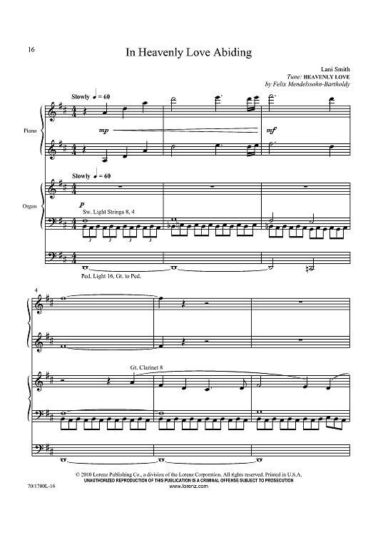 Digital Sheet Music for In Heavenly Love Abiding by Felix Mendelssohn, Lani Smith scored for Organ and Piano; id:433515
