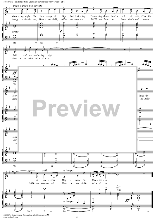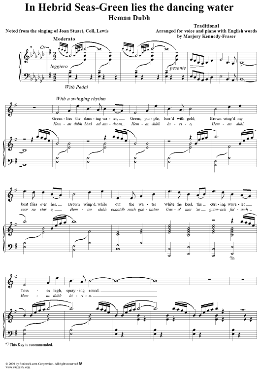 Digital Sheet Music for In Hebrid Seas-Green lies the dancing water, Heman Dubh by Marjory Kennedy-Fraser, Traditional scored for Piano/Vocal; id:260057
