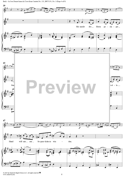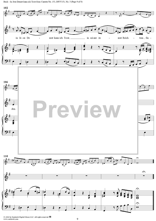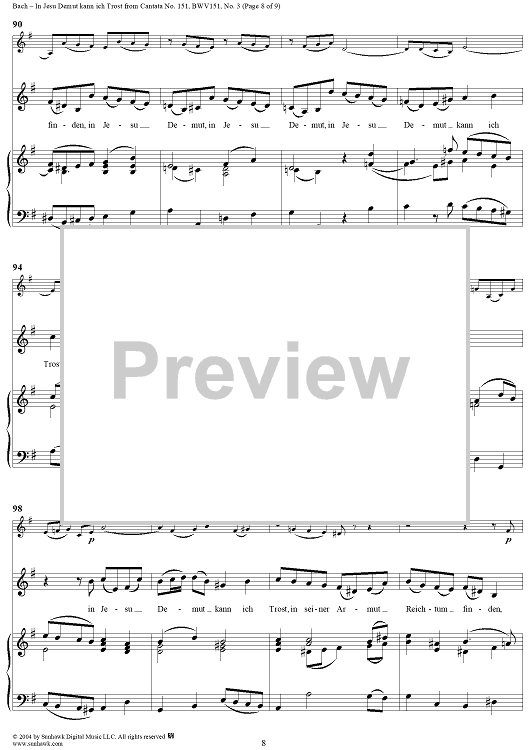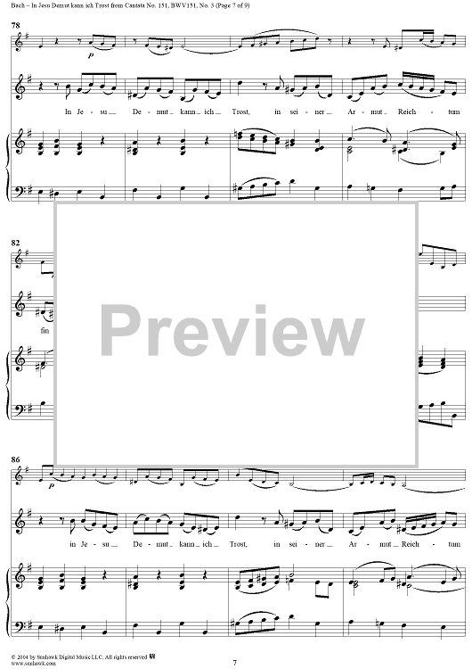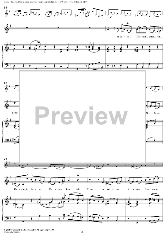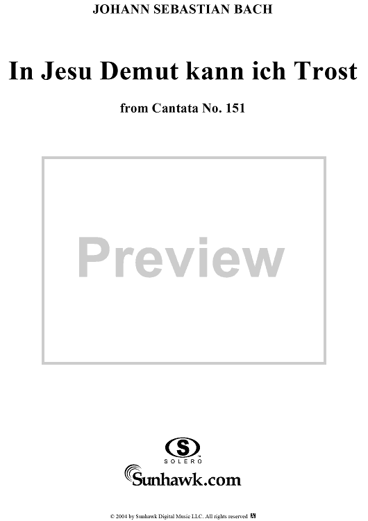 Digital Sheet Music for "In Jesu Demut kann ich Trost", Aria, No. 3 from Cantata No. 151: "Süsser Trost, mein Jesus kömmt" - Piano Score by Johann Sebastian Bach scored for Alto, Oboe d'amore or Violin and Piano or Organ; id:303543