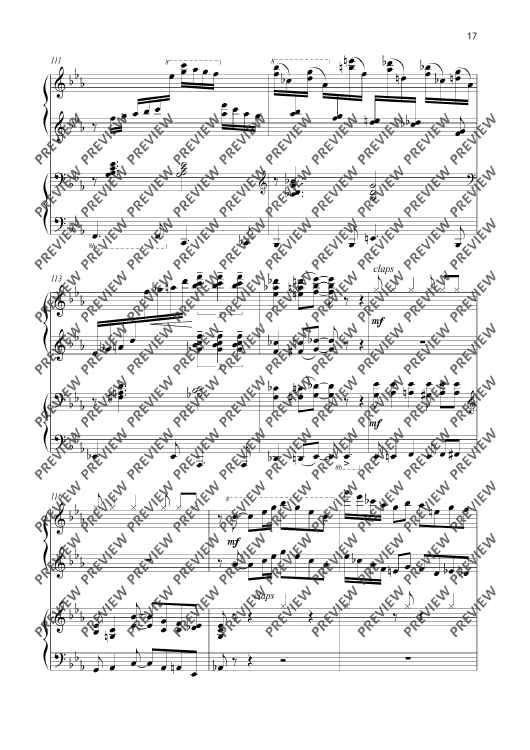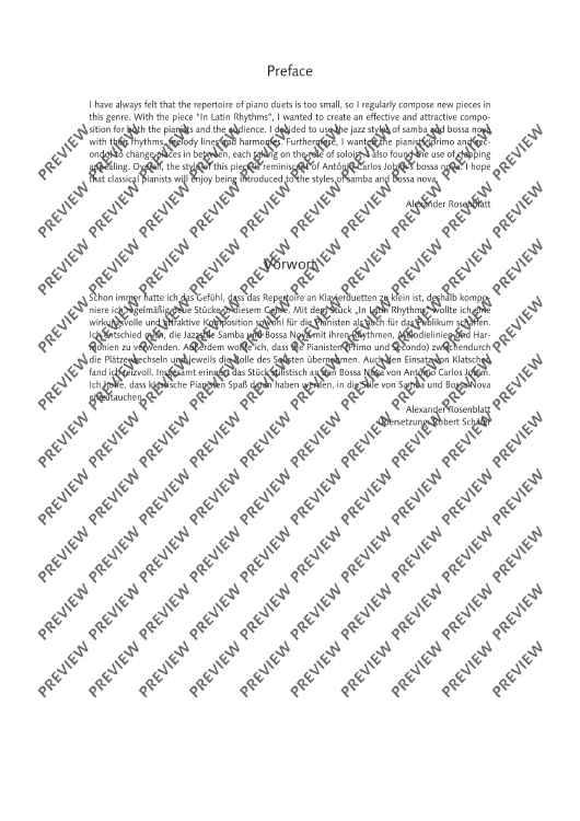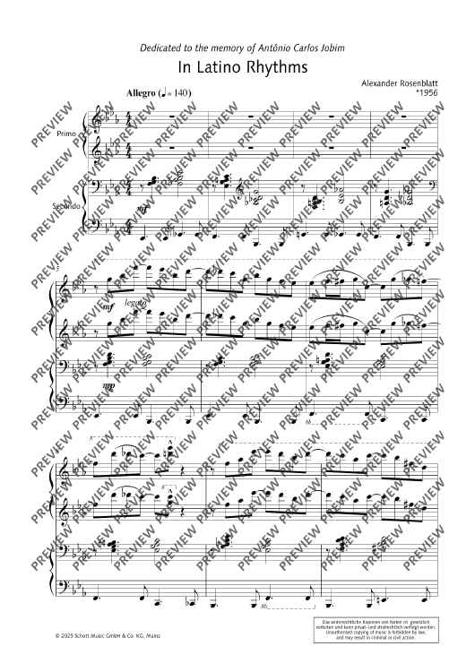 Alexander Rosenblatt's “In Latin Rhythms” is a rousing homage to samba and bossa nova. Inspired by Antônio Carlos Jobim, this piano duet offers gripping rhythms, jazzy harmonies, use of clapping and a change of soloist positions. A must for classical pianists who want to explore Latin American jazz styles!