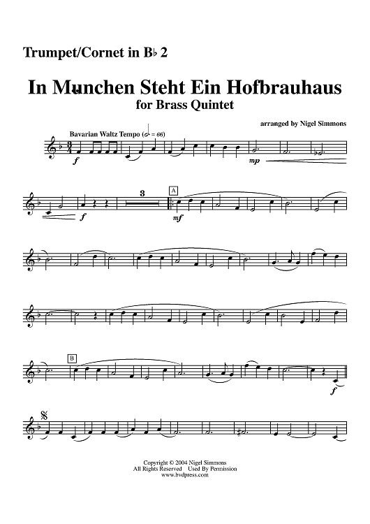 Digital Sheet Music for In München Steht Ein Hofbrauhaus - Trumpet 2 by Nigel Simmons scored for Brass Quintet; id:311805