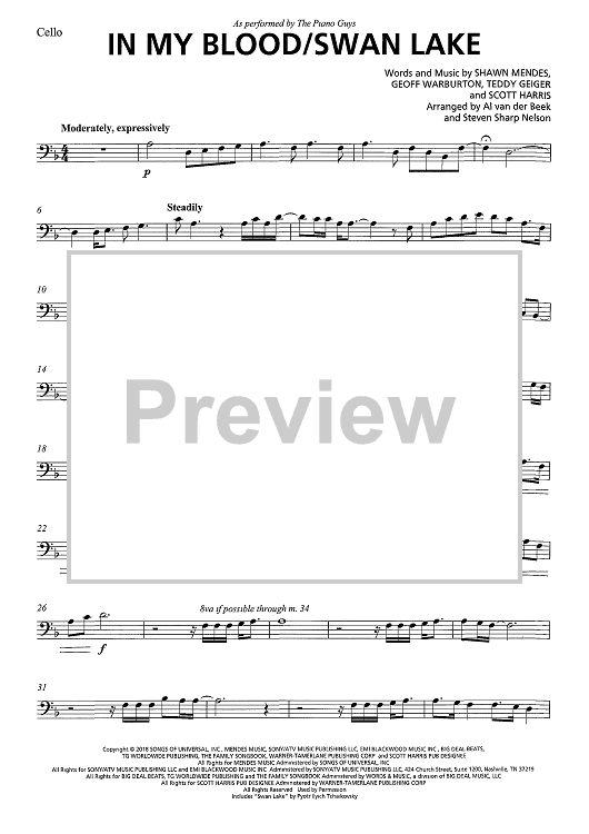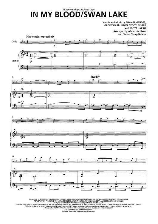 Digital Sheet Music for In My Blood/Swan Lake (As performed by The Piano Guys) by Teddy Geiger, Al Van Der Beek, Steven Sharp Nelson, The Piano Guys, Scott Harris, Shawn Mendes, Geoffrey Warburton scored for Cello and Piano; id:467385