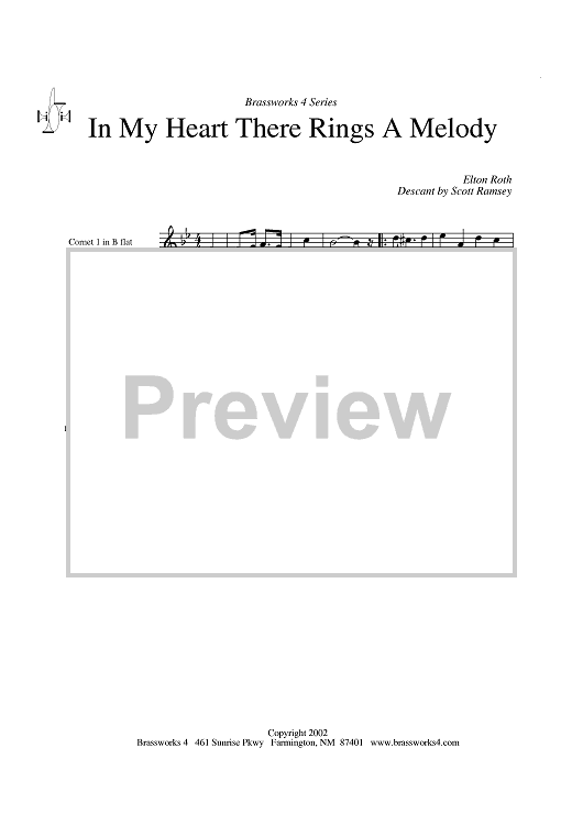 Digital Sheet Music for In My Heart There Rings a Melody - Cornet 1 in B-flat by Elton M. Roth, Scott A. Ramsey scored for Brass Quartet with Optional Descant; id:317140