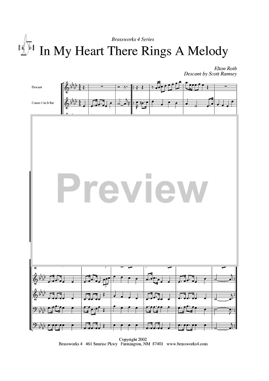 Digital Sheet Music for In My Heart There Rings a Melody - Score by Elton M. Roth, Scott A. Ramsey scored for Brass Quartet with Optional Descant; id:317137