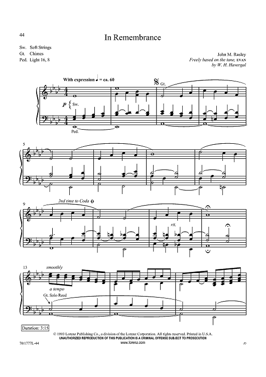 Digital Sheet Music for In Remembrance by John M. Rasley, W. H. Havergal scored for Organ Solo; id:437688