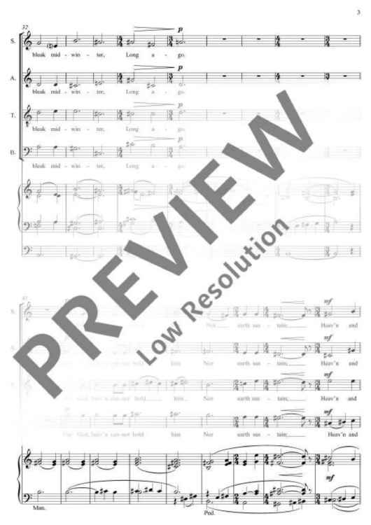 Composed for the Alwinton and Holystone Church Choir near the composer's home in Northumberland, John Casken sets Christina Rossetti's In the bleak mid-winter - a poem popularised by Gustav Holts' setting of the same name for SATB choir and organ. A traditional carol based on the nativity it paints a vivid picture of the chill of winter and is ideal for choirs wishing to move away from the well-known whilst retaining an element of tradition. Constantly flowing organ lines create a sense of unease but this is uplifting music with subtle crescendos and powerful homophonic writing for the voices.