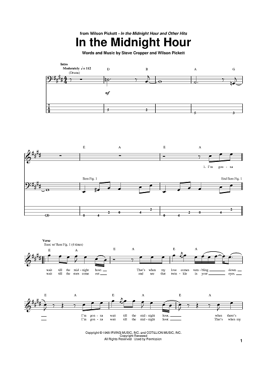 Digital Sheet Music for In The Midnight Hour by Steve Cropper, Wilson Pickett scored for Bass Tab; id:384110