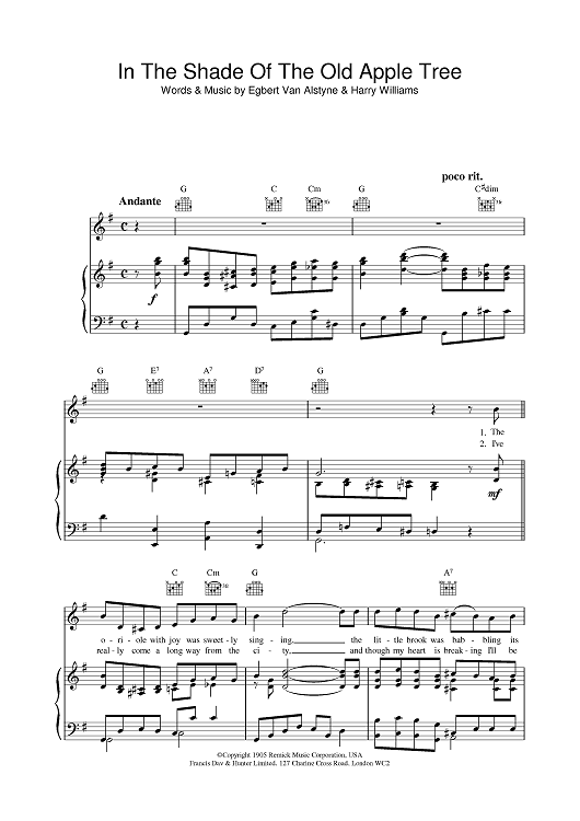 Digital Sheet Music for In The Shade Of The Old Apple Tree by Egbert Van Alstyne, Harry Williams scored for Piano/Vocal/Chords; id:376659