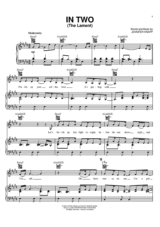 Digital Sheet Music for In Two (The Lament) by Jennifer Knapp scored for Piano/Vocal/Chords; id:373759