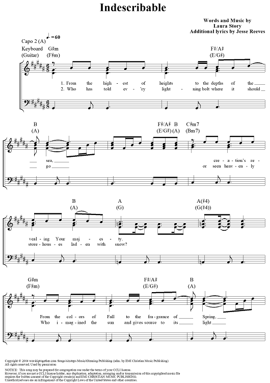 Digital Sheet Music for Indescribable by Jesse Reeves, Laura Story scored for Piano/Vocal/Chords; id:320937