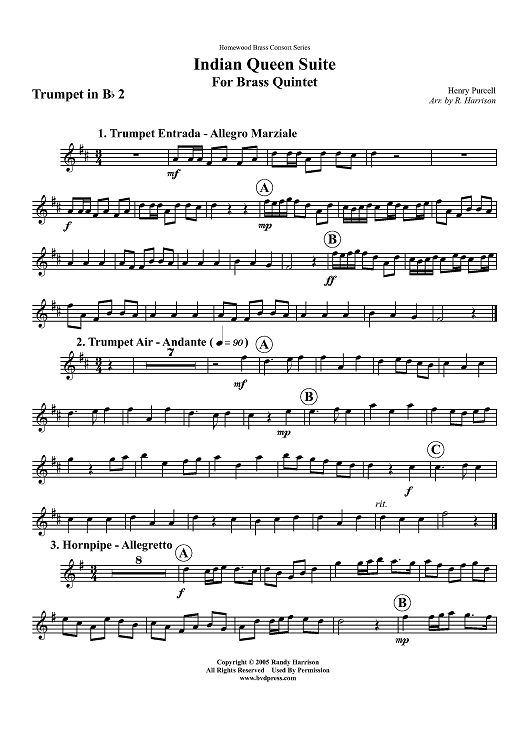 Digital Sheet Music for Indian Queen Suite - Trumpet 2 in B-flat by Henry Purcell, Randy Harrison scored for Brass Quintet; id:355147