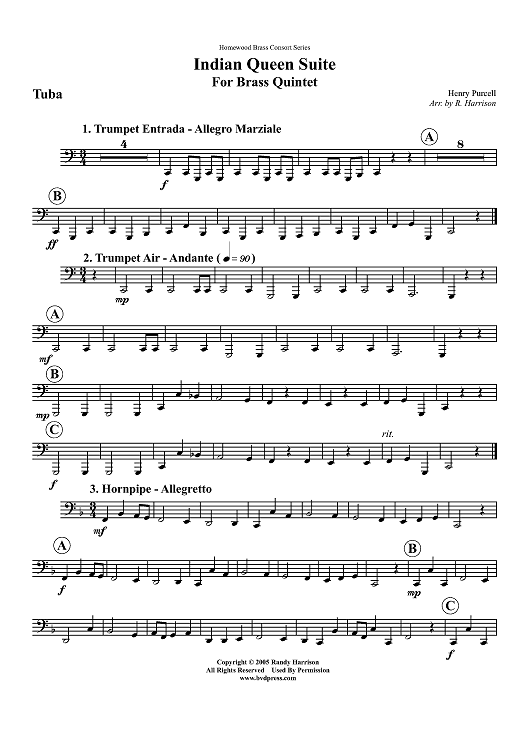 Digital Sheet Music for Indian Queen Suite - Tuba by Henry Purcell, Randy Harrison scored for Brass Quintet; id:355150