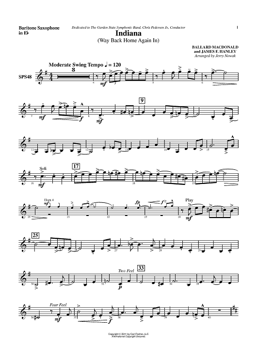 Digital Sheet Music for Indiana (Way Back Home Again in) - Baritone Sax by James F. Hanley, Ballard MacDonald, Jerry Nowak scored for Concert Band; id:420661