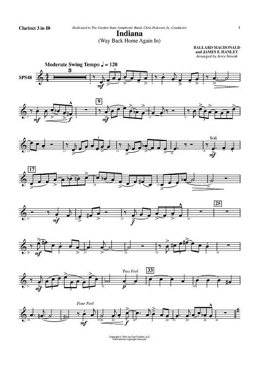 Digital Sheet Music for Indiana (Way Back Home Again in) - Clarinet 3 in Bb by James F. Hanley, Ballard MacDonald, Jerry Nowak scored for Concert Band; id:420654