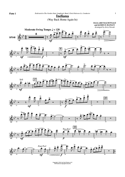 Digital Sheet Music for Indiana (Way Back Home Again in) - Flute 1 by James F. Hanley, Ballard MacDonald, Jerry Nowak scored for Concert Band; id:420648