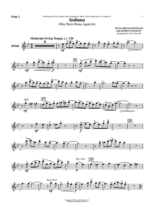Digital Sheet Music for Indiana (Way Back Home Again in) - Flute 2 by James F. Hanley, Ballard MacDonald, Jerry Nowak scored for Concert Band; id:420649