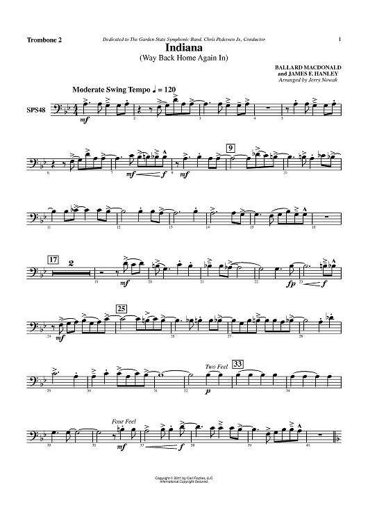 Digital Sheet Music for Indiana (Way Back Home Again in) - Trombone 2 by James F. Hanley, Ballard MacDonald, Jerry Nowak scored for Concert Band; id:420670