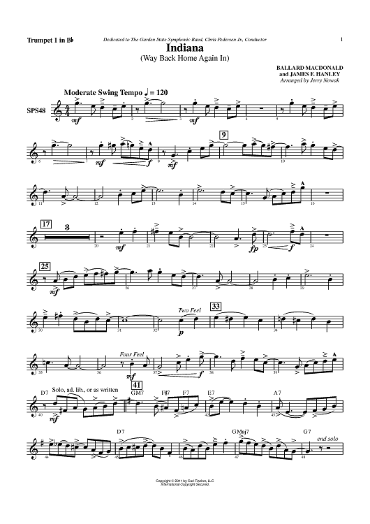 Digital Sheet Music for Indiana (Way Back Home Again in) - Trumpet 1 in Bb by James F. Hanley, Ballard MacDonald, Jerry Nowak scored for Concert Band; id:420662