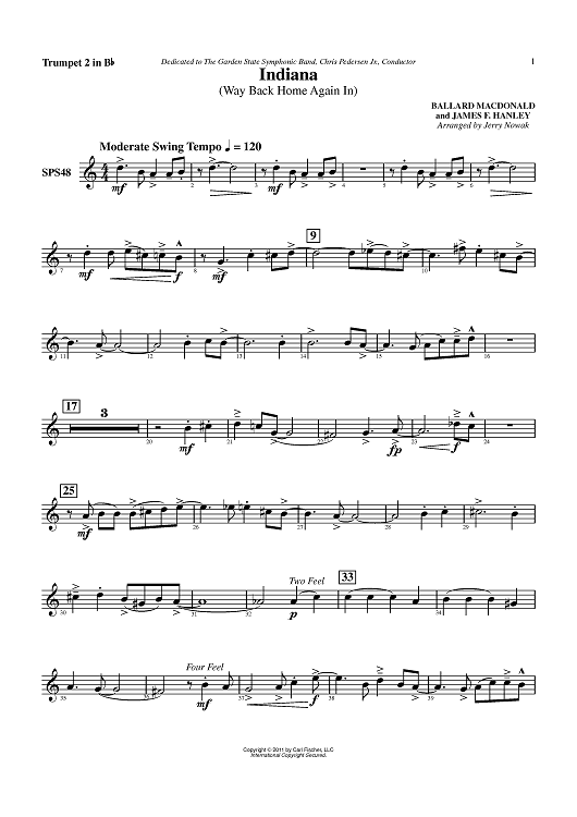 Digital Sheet Music for Indiana (Way Back Home Again in) - Trumpet 2 in Bb by James F. Hanley, Ballard MacDonald, Jerry Nowak scored for Concert Band; id:420663