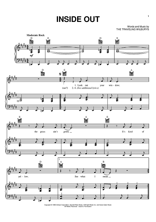 Digital Sheet Music for Inside Out by Bob Dylan, George Harrison, Tom Petty, Jeff Lynne, The Traveling Wilburys scored for Piano/Vocal/Chords; id:402444