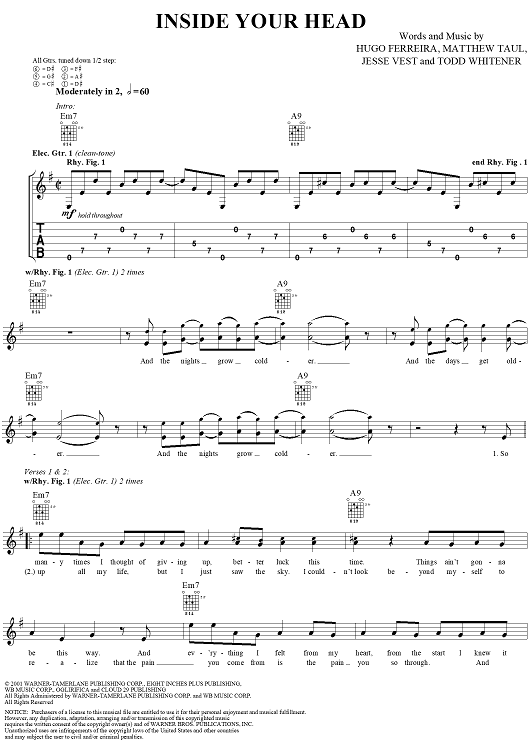 Digital Sheet Music for Inside Your Head by Todd Whitener, Tantric, Hugo Ferreira, Matthew Taul, Jesse Vest scored for Guitar Tab/Vocal; id:287758