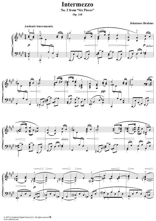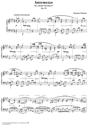 "Intermezzo, No. 2 from "Six Pieces". Op. 118" Sheet Music by Johannes Brahms
