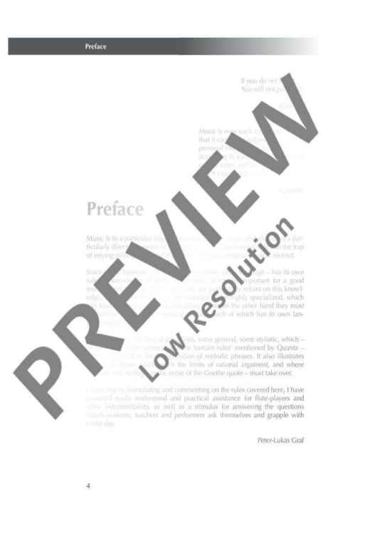 Musical interpretation is first and foremost a question of shaping a melody or the melodic line of a setting. Music, like any language, follows its own set of rules and a sufficient knowledge and familiarity with musical ‘grammar’ is therefore an essential prerequisite of any convincing interpretation. The internationally renowned performer and teacher Peter-Lukas Graf explains in great detail the parameters that have to be taken into account for a successful interpretation: rhythm, metre, agogics, articulation, phrasing, ornamentation and implied polyphony, etc. Numerous examples from the flute repertoire of the 17th–20th century serve as models from which he derives the ‘rules’ appropriate for an interpretation in keeping with each period. – These rules are not intended to be dogmatic but instead should stimulate the players to form their own opinion.