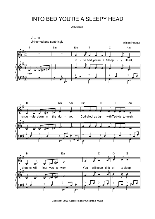 Digital Sheet Music for Into Bed, You're A Sleepy Head by Alison Hedger scored for Piano/Vocal/Chords; id:391579