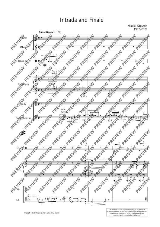Digital Sheet Music for Intrada and Finale - Score and Parts by Nikolai Kapustin scored for Flute, Oboe, Piano, Viola, Double Bass, Drums; id:505691