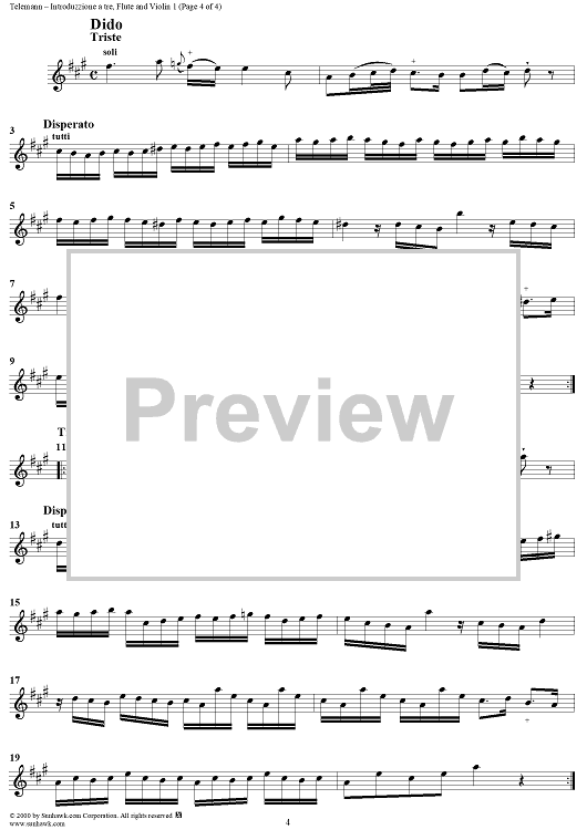 Digital Sheet Music for Introduzzione à Tre - Flute 1/Violin 1 by Georg Philipp Telemann scored for 2 Flutes, 2 Violins, Continuo; id:143720