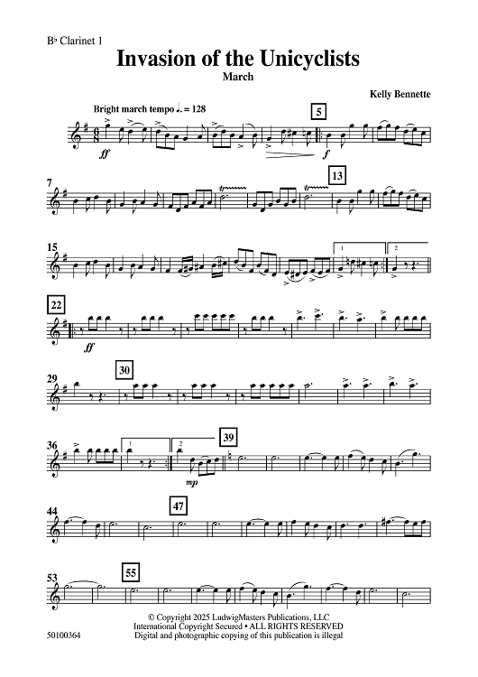 Digital Sheet Music for Invasion of the Unicyclists - Bb Clarinet 1 by Kelly Bennette scored for Concert Band; id:509499