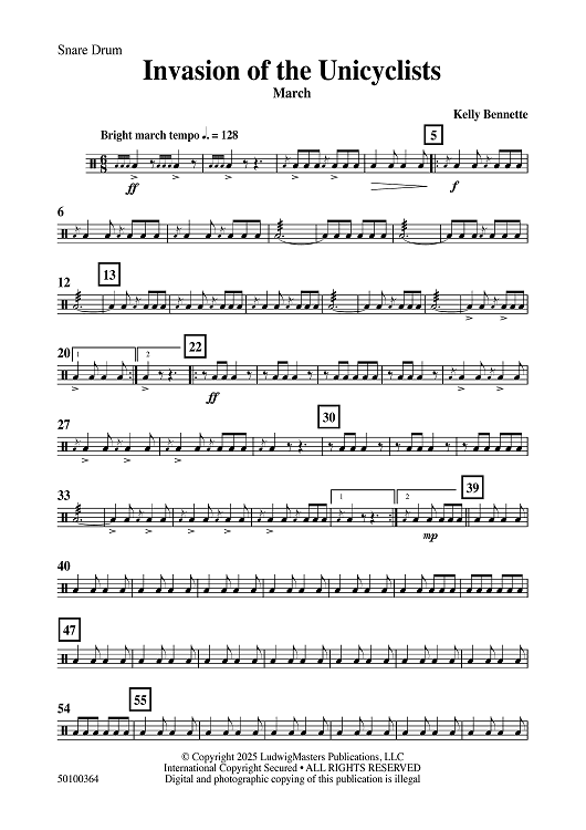 Digital Sheet Music for Invasion of the Unicyclists - Snare Drum by Kelly Bennette scored for Concert Band; id:509518