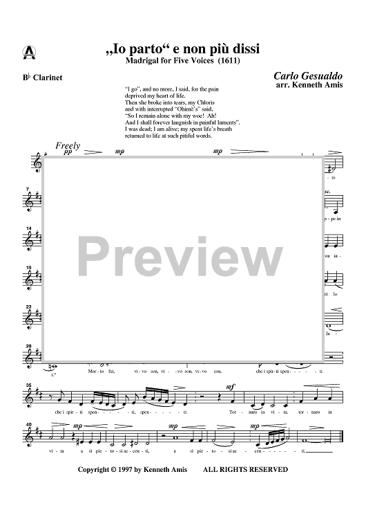 Digital Sheet Music for Io parto e non piu dissi - Clarinet in B-flat by , Carlo Gesualdo, Kenneth Amis scored for Woodwind Quintet; id:365545