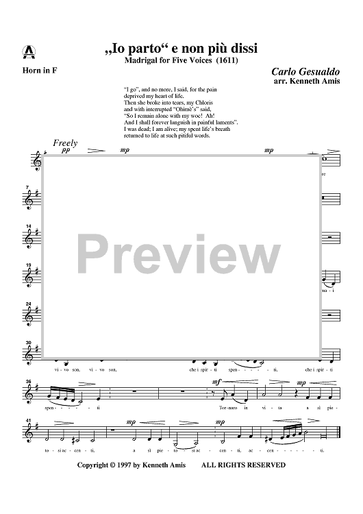 Digital Sheet Music for Io parto e non piu dissi - Horn in F by , Carlo Gesualdo, Kenneth Amis scored for Woodwind Quintet; id:365546