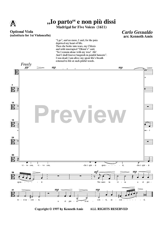 Digital Sheet Music for Io parto e non piu dissi - Optional Viola (for Cello 1) by , Carlo Gesualdo, Kenneth Amis scored for String Quintet; id:365495