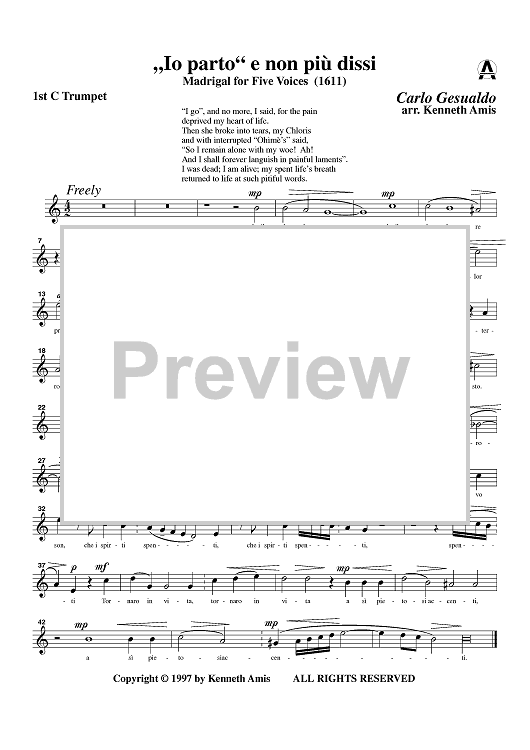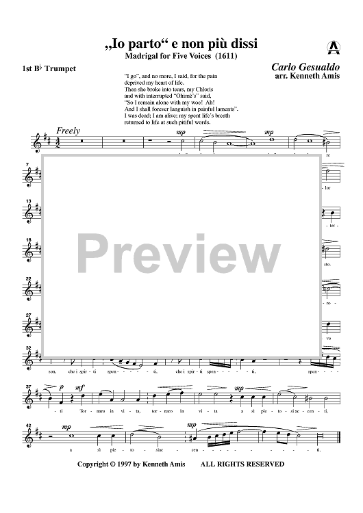 Digital Sheet Music for Io parto e non più dissi - Trumpet 1 in B-flat and C by , Carlo Gesualdo, Kenneth Amis scored for Brass Quintet; id:363169
