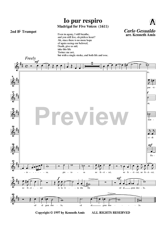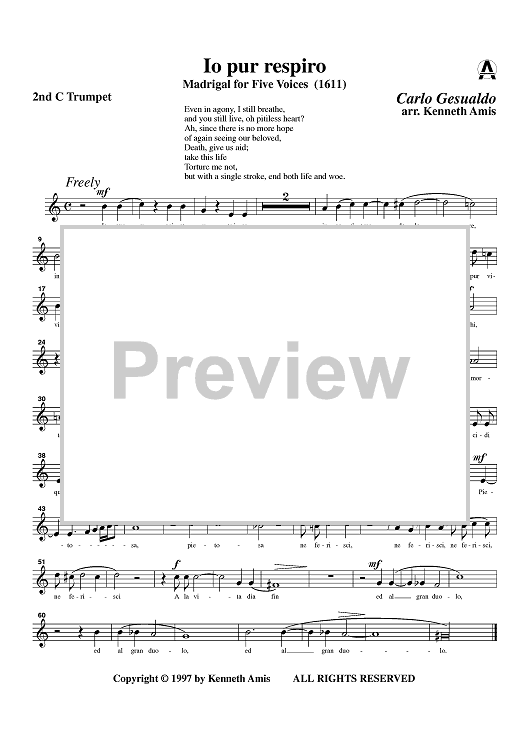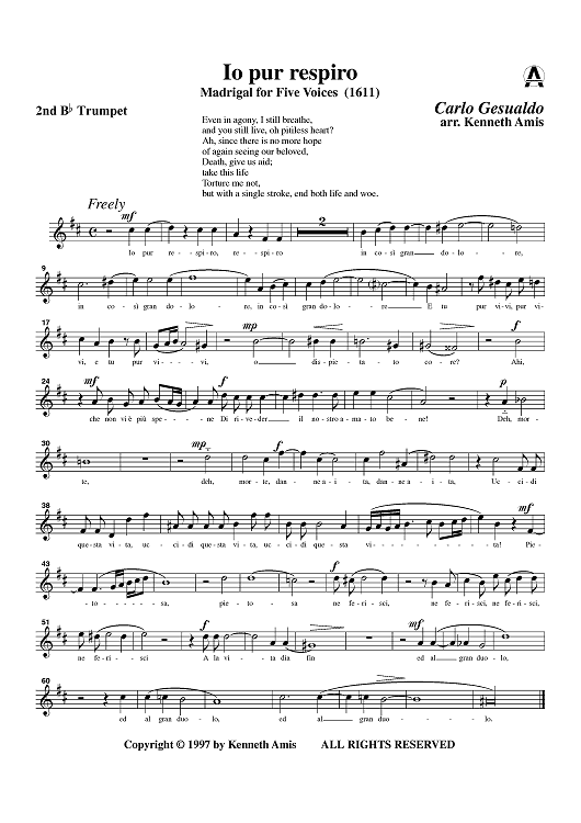Digital Sheet Music for Io pur respiro - Trumpet 2 in B-flat and C by , Carlo Gesualdo, Kenneth Amis scored for Brass Quintet; id:363183