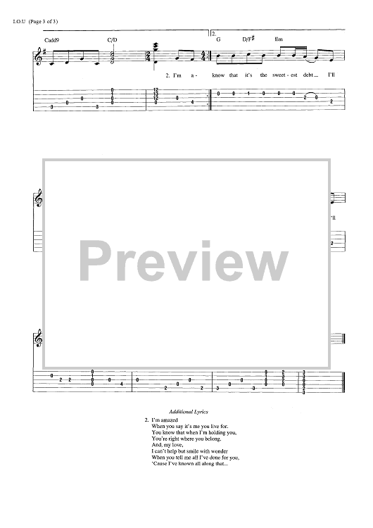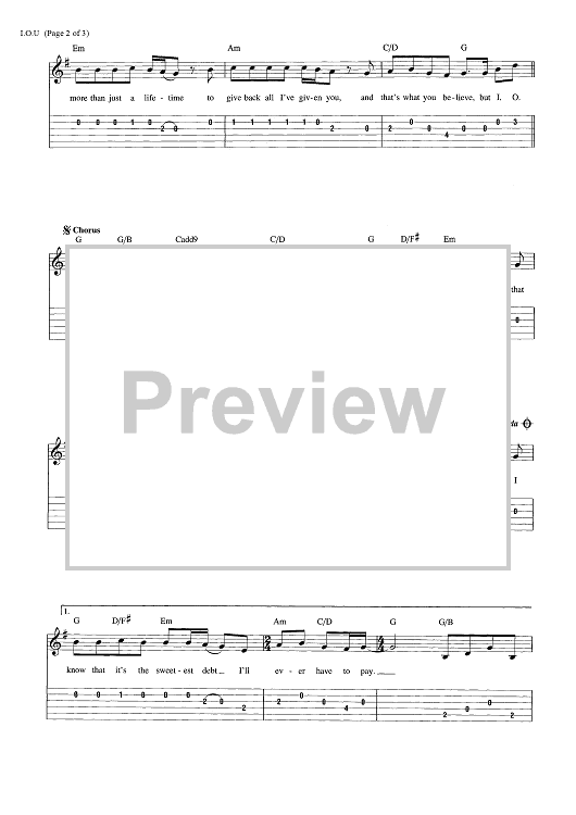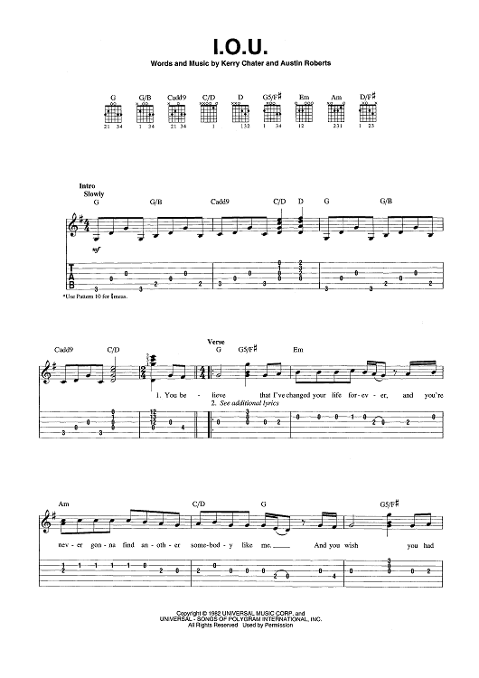 Digital Sheet Music for I.O.U. by Kerry Chater, Austin Roberts, Lee Greenwood scored for Easy Guitar Tab/Vocal/Chords; id:456764