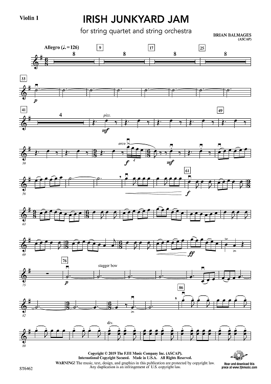"Irish Junkyard Jam for string quartet and string orchestra - Violin 1" Sheet Music by Brian Balmages