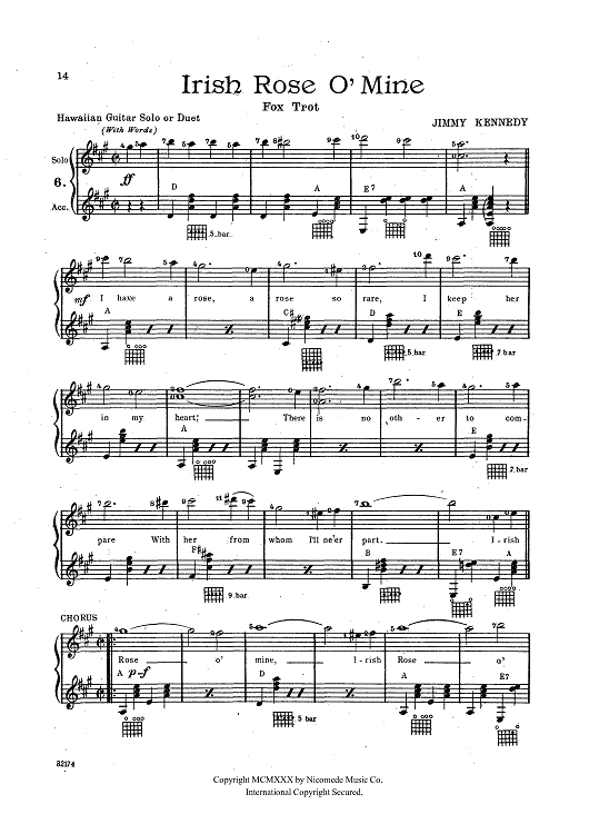 Digital Sheet Music for Irish Rose O' Mine by , Jimmy Kennedy, Paula Nahiku scored for Hawaiian Guitar; id:429422