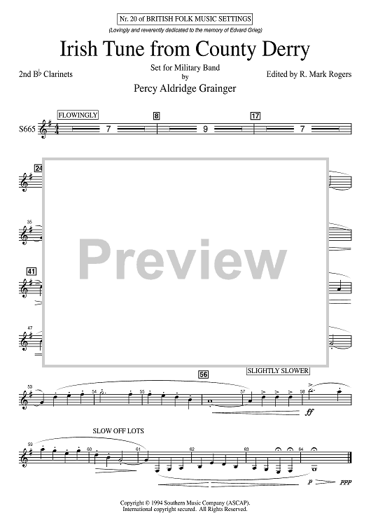 "Irish Tune from County Derry - Bb Clarinet 2" Sheet Music by Percy Grainger