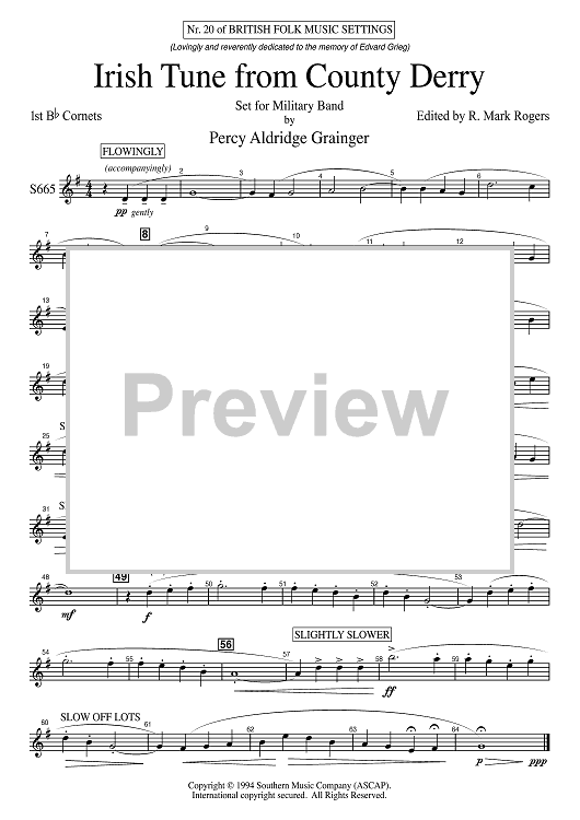 Digital Sheet Music for Irish Tune from County Derry - Bb Cornet 1 by Percy Grainger scored for Concert Band; id:502802