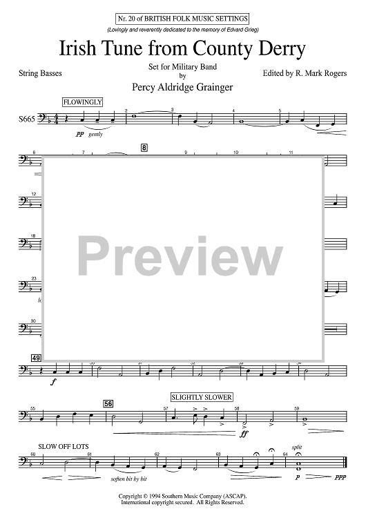 Digital Sheet Music for Irish Tune from County Derry - String Bass by Percy Grainger scored for Concert Band; id:502815