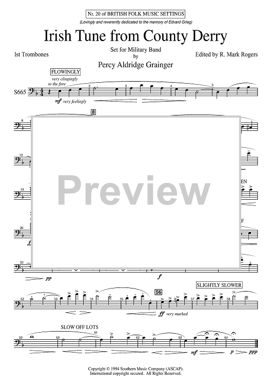 Digital Sheet Music for Irish Tune from County Derry - Trombone 1 by Percy Grainger scored for Concert Band; id:502810