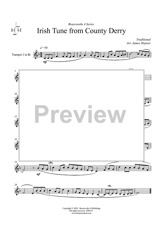 Digital Sheet Music for Irish Tune From County Derry - Trumpet 2 in B-flat by Traditional, James Haynor scored for Brass Quintet; id:411157