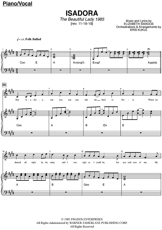 Digital Sheet Music for Isadora by Elizabeth Swados, Kris Kukul scored for Piano/Vocal/Chords; id:469449
