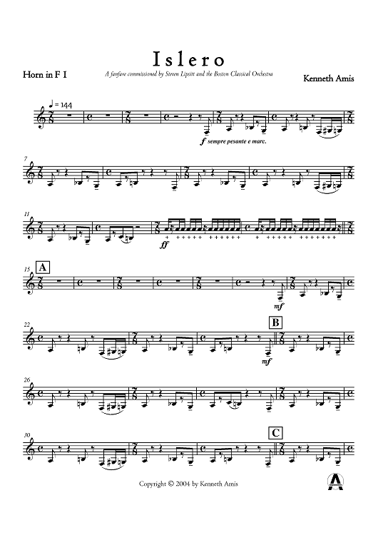 "Islero - Horn 1" Sheet Music by Kenneth Amis